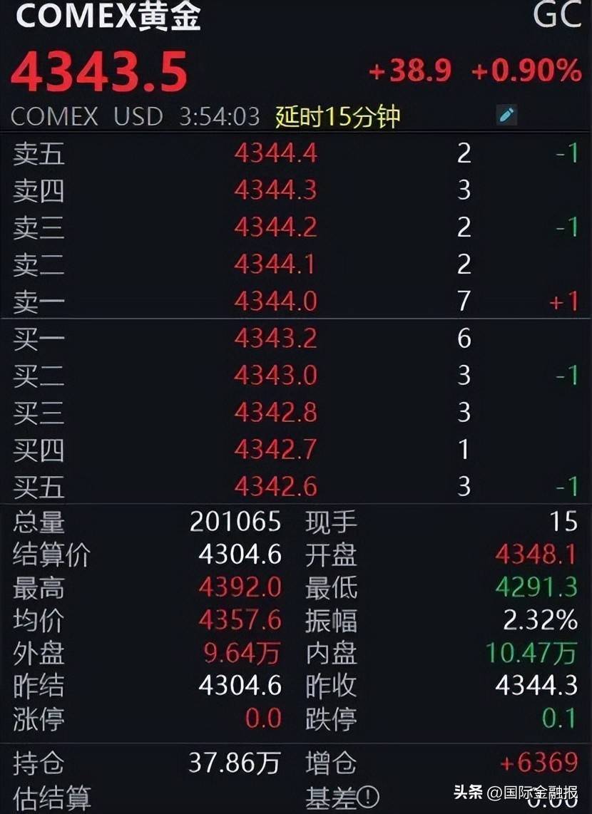 期货方面,COMEX黄金期货亦实现大涨。截至记者发稿,COMEX黄金期货日内涨0.9%,报4343.5美元/盎司,盘中最高触及4392美元/盎司,亦创下历史新高。