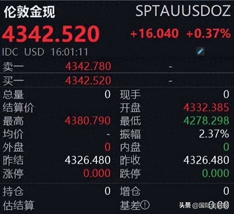 截至记者发稿,伦敦金现报4342.52美元/盎司,日内涨0.37%,盘中最高触及4380.79美元/盎司,再创历史新高。